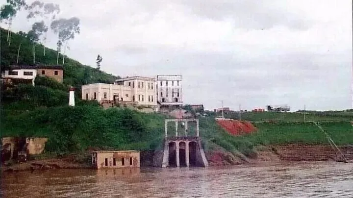 这个楼就是当年的鹅公涌水闸,三层的老房子擦着河沿,最下头是大水闸口,小时候下大雨,爸妈还特地带过去看闸门放水,水流冲出来气势很大,站远望过去只见水花带着泥黄,闸口墙头爬满青苔,村里娃娃比赛扔石头看谁能飞过闸,等到洪水退去,会有钓鱼佬靠着闸口晃一上午。