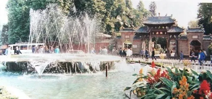 图中大水池喷水柱,就是佛山人记忆里的祖庙广场喷泉,正门一进去,先被那阵哗啦啦的水声吸引住,水柱穿天而起,池边总挤满看热闹的孩子,家长坐在花坛边乘凉,有一年喷泉还装了彩灯,晚上整个喷泉圈被彩色灯光包着,水雾在灯下打得五颜六色,小孩经常凑太近一下给水珠溅一脸,回头笑得肚子疼,爷爷一边看一边笑,说这个喷泉是那时候的“城市景观”,新鲜得很,水池边结下缆绳还防着小孩掉下去。