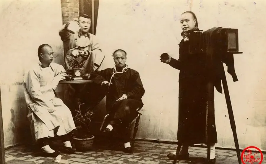 图中这台大家伙叫照相机,可不是现在的随手一拍就出片,笨重三条腿,黑布一蒙,前面那位就是摄影师,手里抓着快门线,神情认真,后头有人泡茶,有人端坐,衣服都是整整齐齐的新料子,看着就知道是头一回来照相馆,爷爷说那时候“照张相就是大事,得摆好半天”,以前的人不爱笑,镜头像镜子一样照出一副正经,谁现在拍照还摆这么端着呀