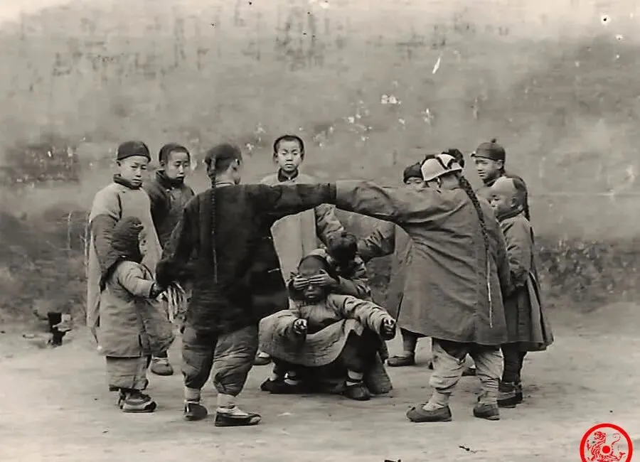 照片里一群小孩玩得正起劲,有的蒙着眼,有的拉着手,动作扭来拧去,怕就是躲猫猫或者丢手绢的玩法,看着衣服又厚又大,有人袖口拉得高,还一脸警觉,小时候那种院里孩子一呼噜噜扎堆的场面现在真见不着了,屋外寒风里该玩还得玩,这股小孩的朝气,旧照片也藏不住