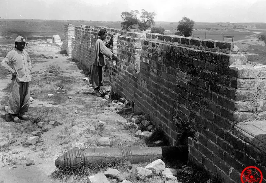 墙根底下横着那支炮,清军的老阵地,破烂砖墙边,站着两个带帽子的男人,一个手插腰一个正砌着墙,周边全是碎石,地上荒着,不用多说,就是八国联军那年把山海关打得稀烂,爷爷总说“打仗留痕难补,墙修上了,心气回不来”,现在人去关口多是旅游打卡,没人记得这段苦头