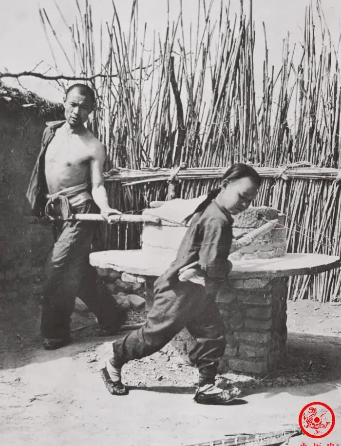 下面这家伙木头石头搁一块,是一套老推磨,一家两口爷们,一大一小在院子里绕着圈儿推,就是为了磨点面,磨一盆粮食得使上大半天,边上竹条篱笆的阴影一下就罩住了人