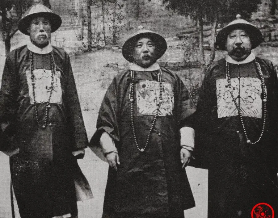 这张照片中站中间的矮胖滚圆那个,就是袁世凯了,头圆脖子粗,旁边两个同僚也是一身官服,袁世凯那身上肥布朝服,映得帽子都小了一个码,脑瓜顶起的大帽檐压着也是一股端劲