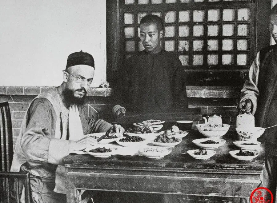 这个洋面孔的老外,坐在满桌子的中餐前,穿着搭在清朝装束,左手叉子右手刀子,盘子碗里全是地道的中式菜码,看这阵仗,伙食可比咱家正月初一还丰盛,一随从在边上站着,像等着随时上菜
