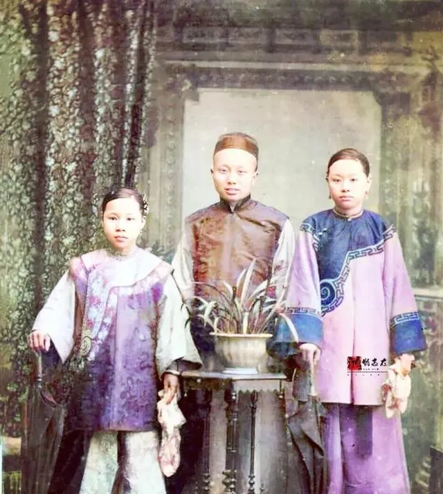 咱也别老盯着权贵看,其实清末的普通人家也有自己的小幸福。看看人家三口之家,小妻子年轻貌美,老公虽然沉稳内敛,但眼神里全是温情。孩子坐在小椅上,笑得憨态可掬,这种简单的幸福,才是最治愈的日常。