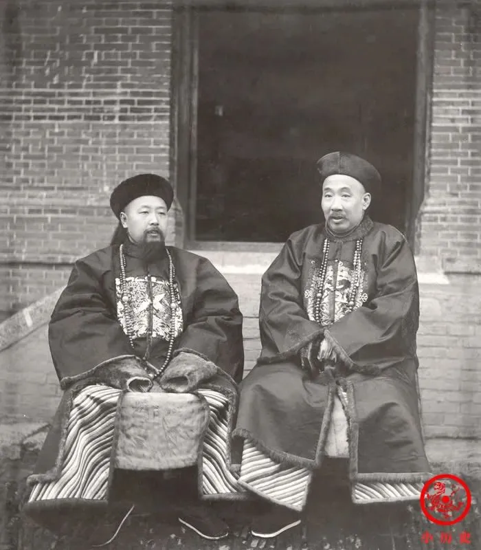 图里坐着的两个穿大褂的大人,一个是两江总督端方,另一个是江苏巡抚陈启泰,身上的官服正经八百,全是缎面厚料,胸口一块补子从领口垂到膝盖快,帽顶压得严丝合缝,裤腿边撇着条纹像一扇旧门帘,手上绞着一对儿貂毛套,天冷起来可真挡风,他们坐在台阶上,神情里那股倦意都藏不住,这种大员穿戴,往家摆也得收拾出点仪式感才对。