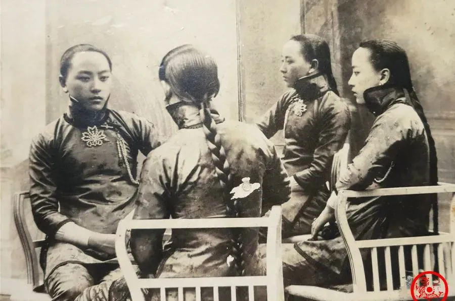 这个老照片瞧着像四个人,其实只有一个姑娘坐在椅子上,镜面一摆,像是出现了三个分身,晚清那会照相馆流行这种耍巧劲的构图,镜子斜着摆,每个角度都能照出一面,人坐得笔直,辫子搭在背后,头上的发钗压得熨帖,衫子乌黑,细看能察出衣角褶纹。