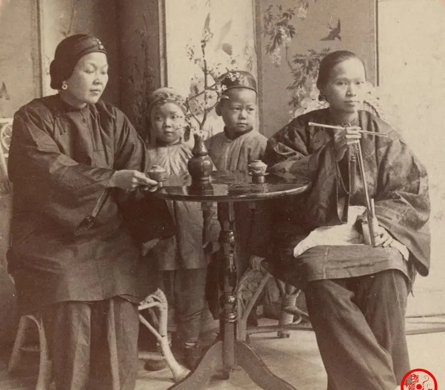 画面里坐着的两位妇女,身后站着小孩子倚着桌腿,桌上摆了一炉老瓷壶和细瓷小碗,左边这位靠在椅背上,有故事的神情里透着几分宽厚,把玩茶盏的手指头一圈圈绕着,右手烟管斜指着桌面,烟丝轻轻磕了两下,再慢慢续一口,屋里静得能听到小孩喘气儿。