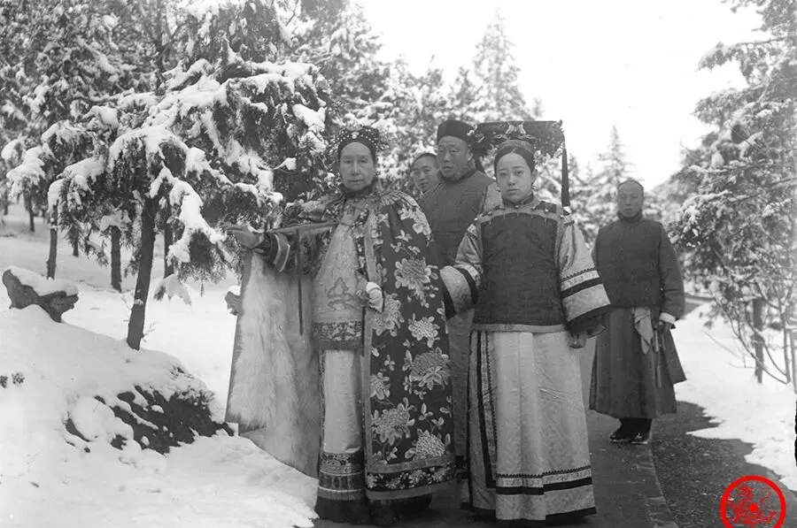 慈禧太后披着厚霞披站在雪地里,身边簇拥着好几个太监宫女,前头的宫女浓眉大眼,穿着厚厚几层袄裙,护着一团白色毛皮,冬天的颐和园雪下得很厚,树枝都压弯了,走在雪地上,脚印一点点落成一行。