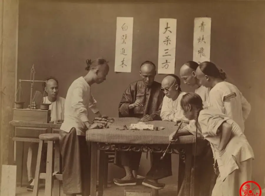 这个赌场挺地道,老照片里人都盯着桌上的铜钱结实得很,那会儿铜钱一摞摞地码着,碰到大场面,旁边还有秤和银两兑换,墙上的字画有意思——"大杀三方","青蚨飞入","白璧进来",全是给赌局打气的吉祥话,意思说得直白,钱输了还能飞回来,做梦也就这样想想。