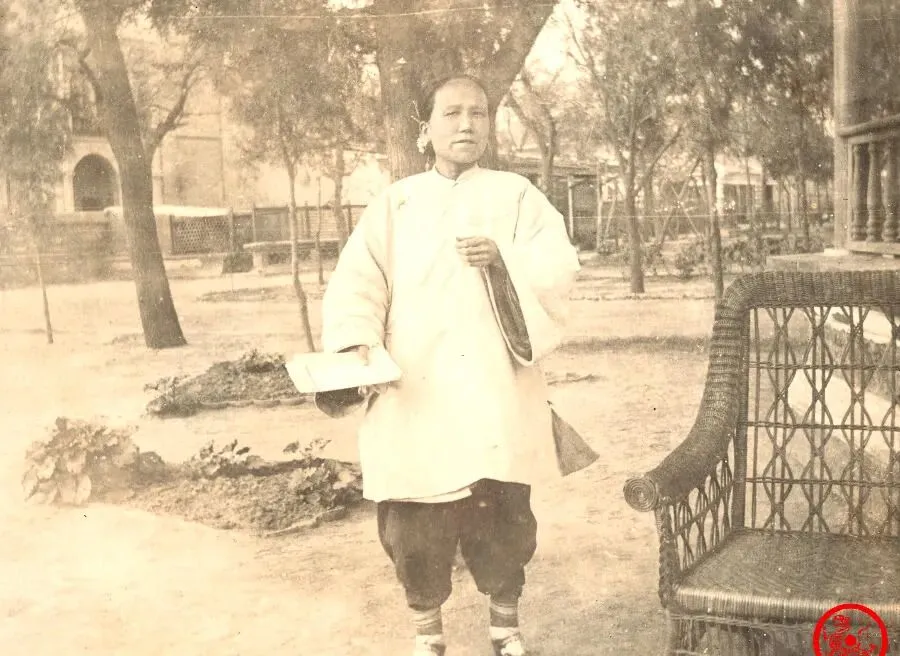 这个站着的人,手里捏着本书,人不多说,衣裳倒利索,外头套了一件大袖夹衣,脚步稳稳的,看脸色是走大门道的那种,不见得常年在屋里,倒像是趁着天好出来透口气,身边的藤椅空着,估计照相那阵还讲究个仪式感。