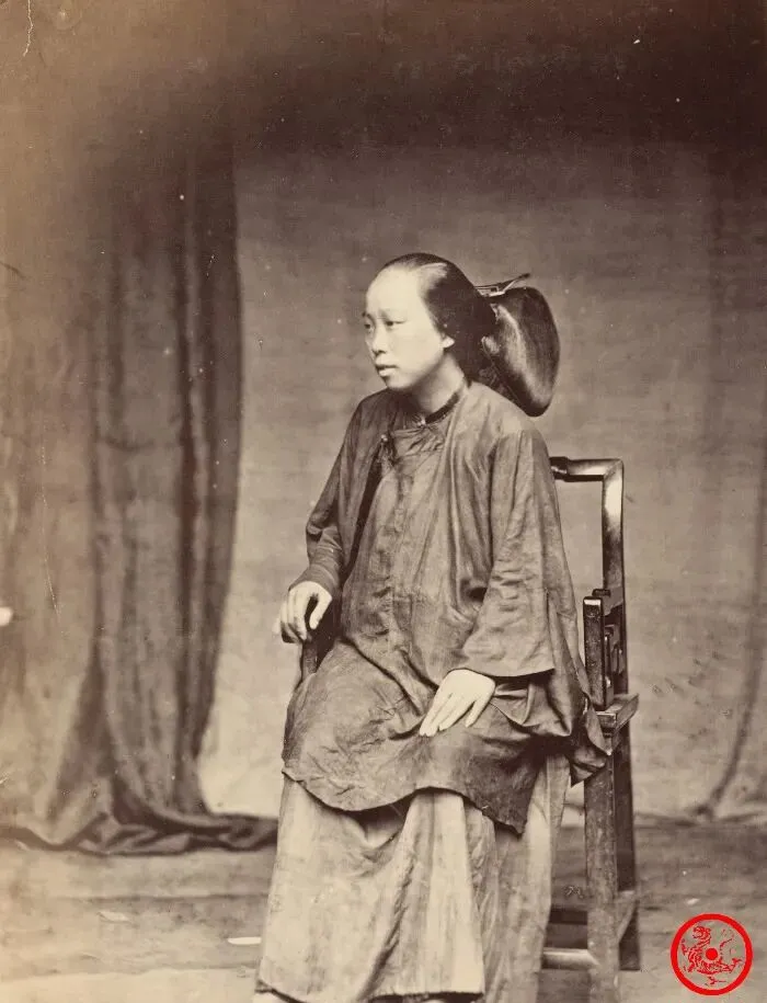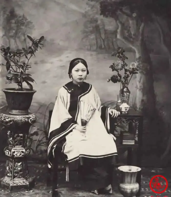 这张相片,拍的是仕女像,姑娘坐得极规矩,手里轻轻握一把小折扇,桌上还有瓶花摆着,前景后景都布置得很雅致,衣袍宽大,袖口边一圈黑边特别亮眼,脚下是那会儿流行的小脚鞋,虽说这玩意儿很讲究,但老一辈的总感慨,啥都能美,就小脚真是美中不足。