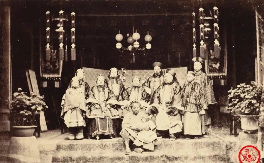 坐在正中间的是家里的大太太,边上的男人全穿着补服,左右的女人也戴着家传首饰,后排还站着下人,怀里抱着娃娃,一大家子合影,架势足够摆出气势来,仆人和主家混合一起拍照,可见那会儿家里和睦才能这样团聚。