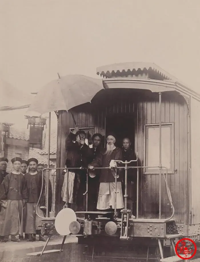 这张照片里站在火车尾的是张之洞,身边小跟班高举阳伞为他遮着太阳,不同的是,这伞是真为官爷备的,不像咱普通百姓家死守着一把油布伞,场面不小,正是京汉铁路通车的大日子,官员簇拥,排场和气派都连城一块。