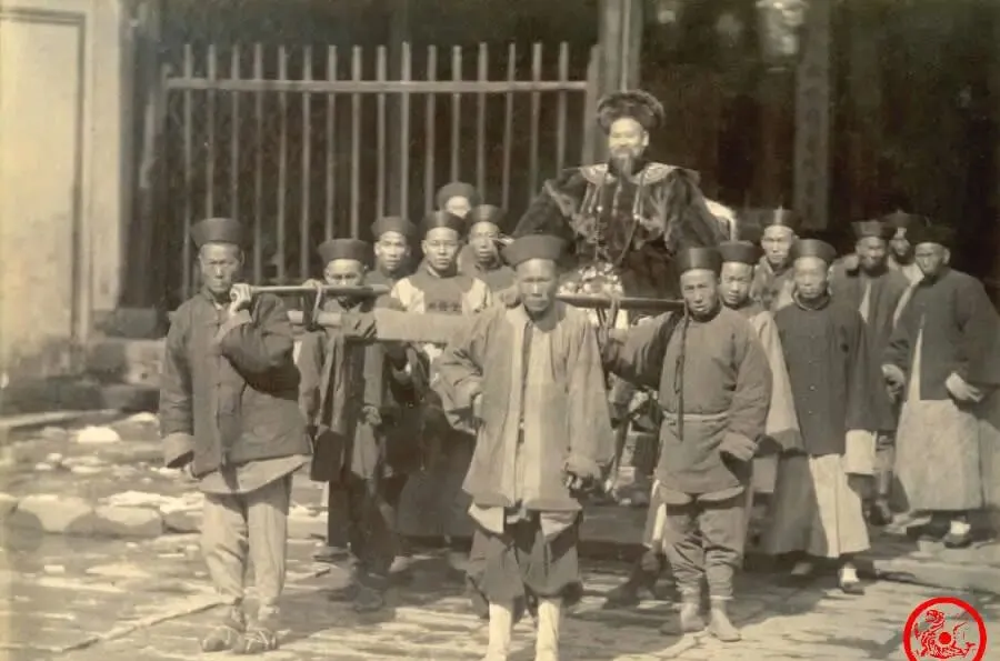 照片最后一张,大臣出门八抬大轿,前呼后拥,光是轿夫就八个,劲头都用在肩上,三品以上才有如今这派头,轿子没有帷幔,露天凉爽,冬天正好晒太阳,后头瞧见随行人等,阵势拉出来那叫威风。