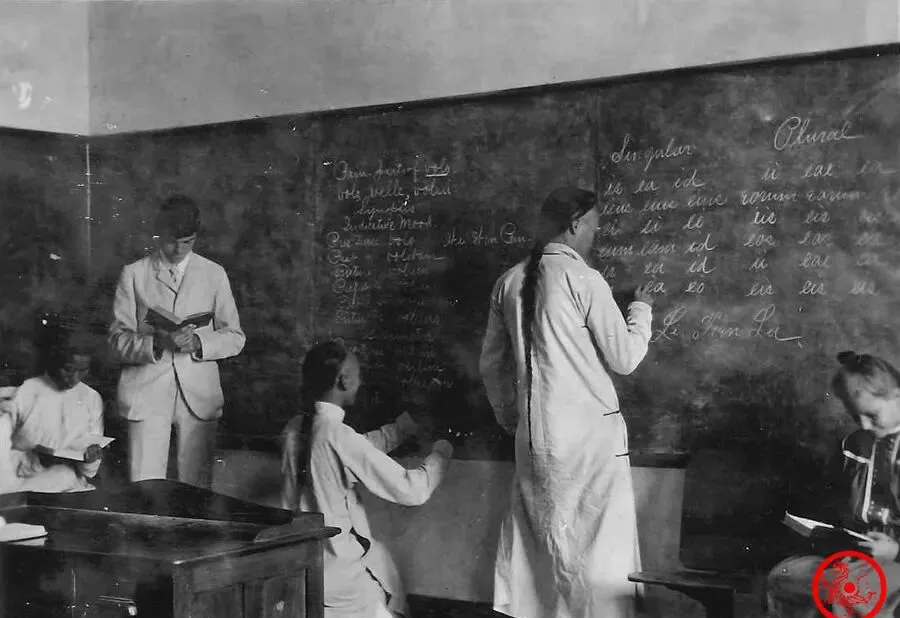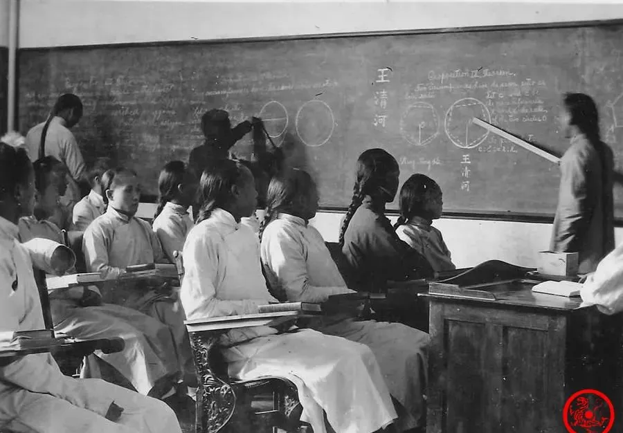 图中是外语课堂,英文或者拉丁文都在黑板上晃着,黑板格子排得严严实实,长衫学生手里攥着教材,一旁的“洋先生”坐着,目光盯得紧,几个学生轮流上前应答,胆子小的一开口语速就慢下来,声音发飘,讲究的不是字正腔圆,全靠耳朵和记性,家里老一辈看到都会低声问一句,“能听懂不”,“反正不是死背经书那一套,背得糊涂了还能硬着头皮试试”,讲外语能让人有点腼腆,但架势摆着,教室里头少不了点紧张气息。