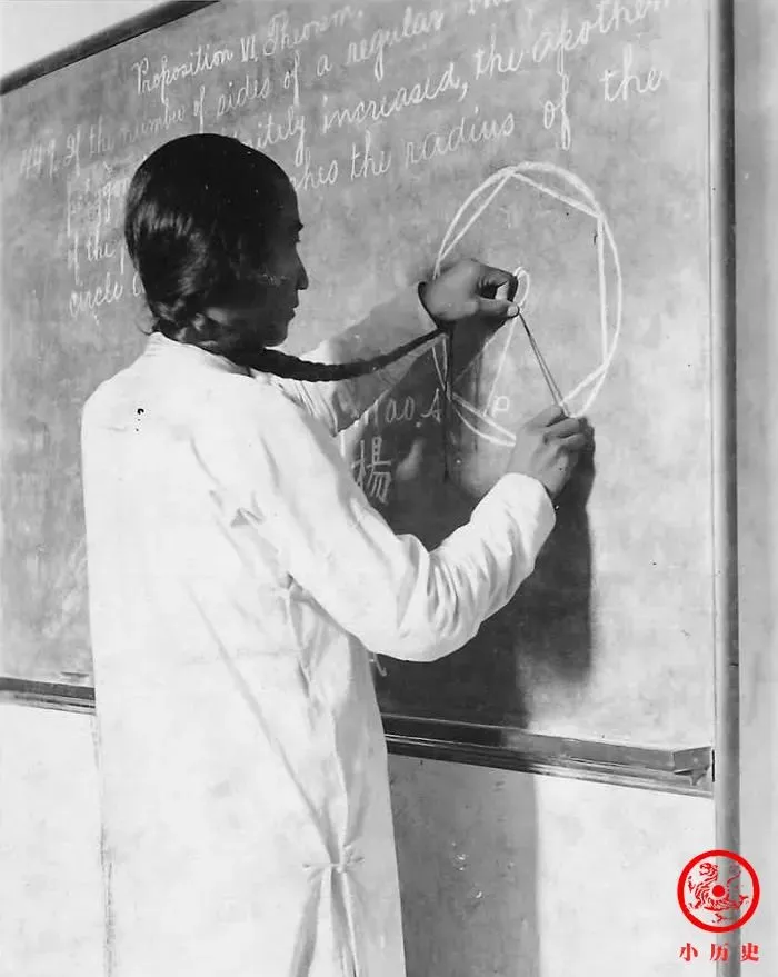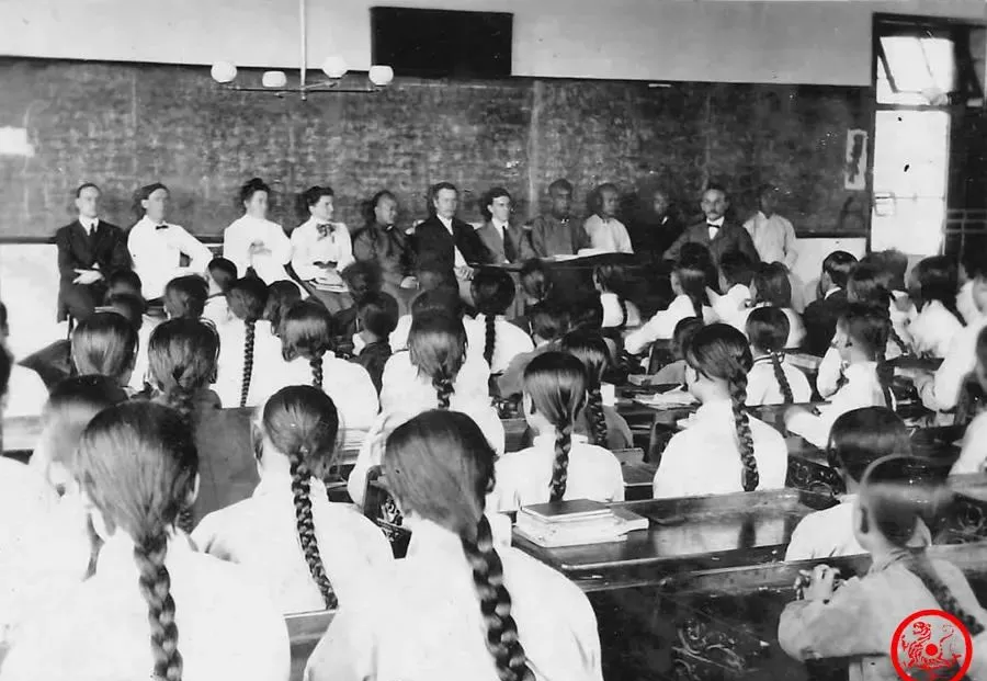 这个场面,清一色的长辫子,黑板前头坐着一圈外籍老师和中方教员,场面有点像年终总结会,谁也不敢分神,只有坐在第二排的小姑娘偶尔偷偷转头看朋友一眼,小时候总觉得大人的开会乏味,其实一百年前开会的学生心里头也不安分,科班出身的女学生当年可金贵咯,“那阵子能进大学堂的女娃,不是一般家庭”,所以每回见到这画面我都得感慨一下,女孩们的辫子像一道道记号,“一辫一辫地走进了新学问”。