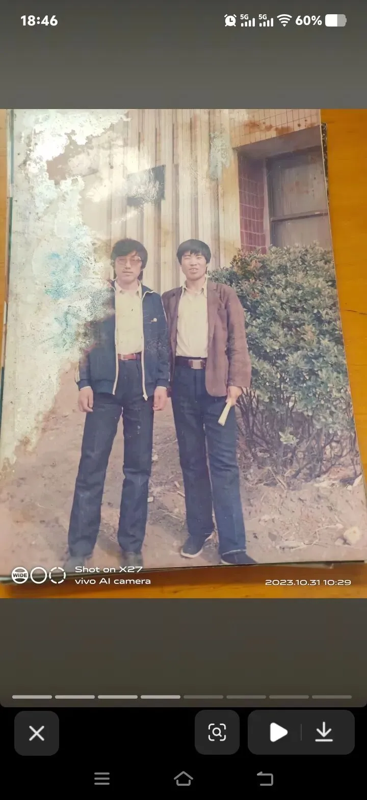翻出这张边角泛黄、带着斑驳痕迹的老照片时,时光仿佛瞬间倒回1987年的运城师专。那年我考上中文系,和班级生活委员在校园门口留下了这帧影像。那时的学校正处初建阶段,斑驳的墙面、简陋的绿植,却掩不住青春的蓬勃——他穿棕色外套,我着深色夹克,两个二十岁左右的青年并肩而立,笑容里藏着对新校园的憧憬,也藏着即将开启的四年师生缘、同窗情。