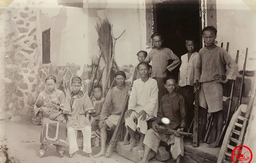 图中的这一大家子,正儿八经的福建漳浦猎户,门前一溜儿的鸟枪长矛,墙上还靠着捆粗竹,男男女女的表情冷静又带点木讷,衣服大多洗得发白,裤脚挽着,一根竹矛搭在肩上,这排场在那时候的福建山林,算是威风大队了。老爷子坐正中手搭着枪管,眼神跟后排的小伙一样,都有点硬,屋里女人抱着娃,咱小时候见过下乡撵野猪的猎人,家里也就能找到两把锈枪头,这家伙们是真敢跟老虎拼命的,打虎英雄哪有几个,更多的其实是守着口粮干活的猎民。