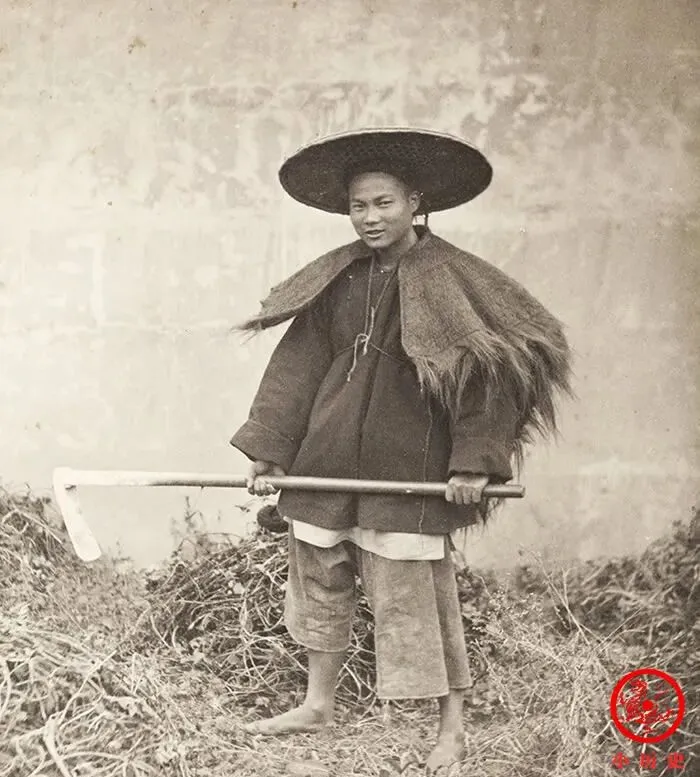 这个汉子,头上顶着青箬笠,身上披一件绿蓑衣,下雨天庄稼地里的打扮,远远看过去就像一团草。那蓑衣捆得严实,雨水一顺裉滑下去,手里抓着铁锄头,裤脚挽着露小腿,这身家伙事天一黑还得接着用,乡下人插秧割麦,晴天雨天都绕不过。那时候的农具粗糙,但手脚麻利的庄稼人,用起来一点不慢,现在小伙子偶尔拿蓑衣照个相,真让他下田,保准顶不上半天。
