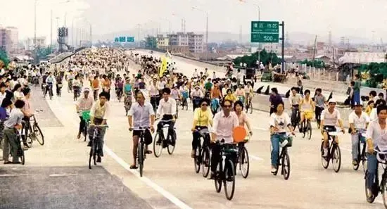 图里这长龙一样的队伍,全都骑在自行车上,八九十年代的早晨就是这样的,谁家有辆28大杠,就是当年最风光的咯,马路不宽也不怕堵,全靠踩,衣裳也干净,风一吹呼啦啦,全是年轻气息,爸爸总爱说,那会儿不管多远,都是一骑就到,风把汗水吹干,裤腿卷一截,右手牢牢抓着车把,哪有那么多私家车,连公交都只能远远看,最普遍的交通工具,就是两条腿踩的老自行车,人人家都有一辆。