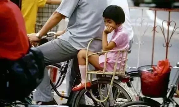 图里小姑娘盘着腿坐在自行车后座的铁椅子上,这个小铁座,就是当年爸妈接送孩子的专用阵地,夏天一放学或者赶集,总有个小孩窝在上头,脑袋靠着大人后背,晃晃悠悠,但从不掉下来,妈妈边踩边回头喊,坐好了啊别乱动,自己小时候戴着红领巾,洗得有点掉色,还爱揪妈妈的衣角,一到红灯路口凑过去看别人自行车篮里都装了啥,有时候后座颠得厉害,还要把自己固定在栏杆里咬着牙忍着,明明没啥安全措施,偏偏一点不怕。