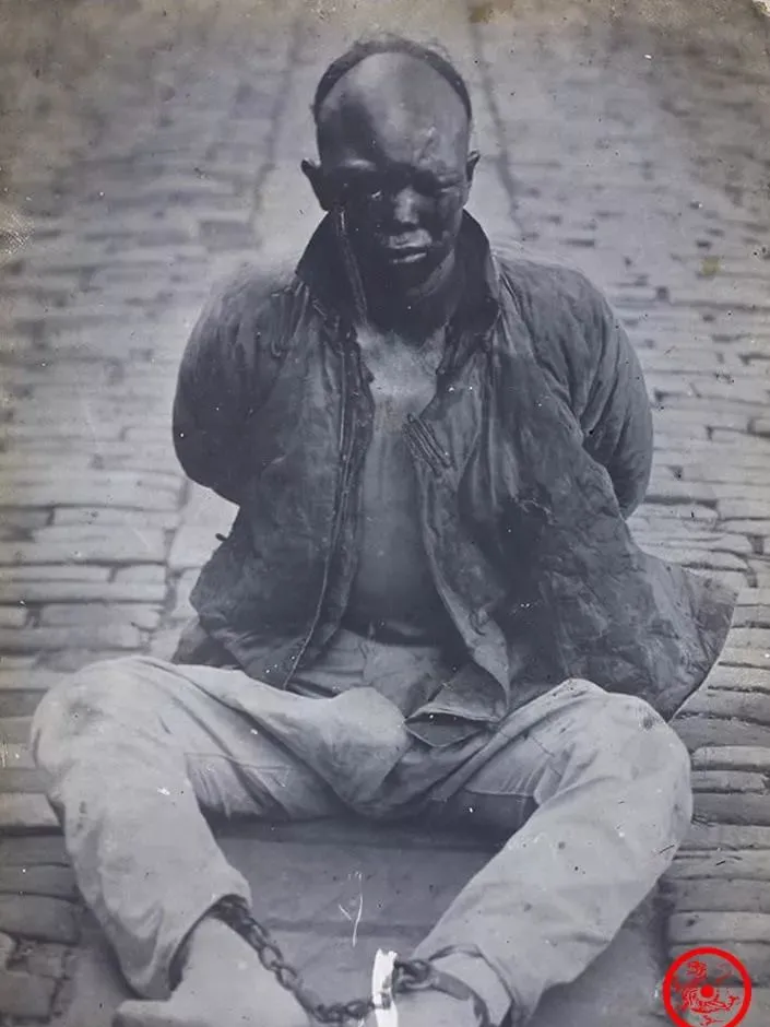 第一张看着心头一紧,图中这个人叫革命志士,已经被清政府抓起来,坐姿别扭,手脚都有铁链,脸上那层灰黑像是烟火熏的,人也说不出是哭还是苦笑,身上的长衫破旧,前襟开着口,腰里还有一截麻绳吊着,砖地冰冷,牢牢地把人死死压着,这种表情以前只在小说里见过,到了照片里才晓得那股真实,让你忍不住想,这人本来也许有家有活,怎么一场风暴说到就到了身上。