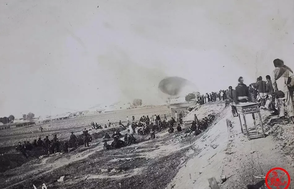 这张是清军炮兵阵地,大炮齐整一字排开,兵们坐小板凳似的蹲在地上,帽檐下的脸藏在阴影里,烟尘透过树枝飘过去,远远能看见乡下草屋一抹灰色,天是白的,树是稀稀拉拉的,这些场景一合起来,几乎能听见炮声炸响的回音,到现在你在乡下还偶尔能看见老房子的残墙断瓦,可那时候屋边一声炮就能让全村人吓没了魂儿,什么劳作温饱全没了指望,打仗就这么把日子撕碎。