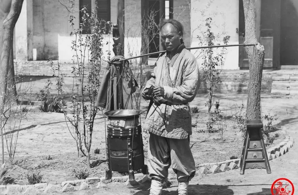 这位是天津的老剃头匠,挑着长杆担子,前头挑的是小火炉和水盆,还冒着烟气,后头挂着木凳子与工具箱,走到哪理到哪。老话说“剃头挑子一头热”,这画面看着直观,小时候淘气在巷口看师傅剃头,水温烫手,动作麻利,剃完一脖子碎发,师傅一乐:“改天再来,头发得长点才有得剃。”现在洗剪吹扫得比谁都快,手艺和慢劲,留在这些老照片里不动了。