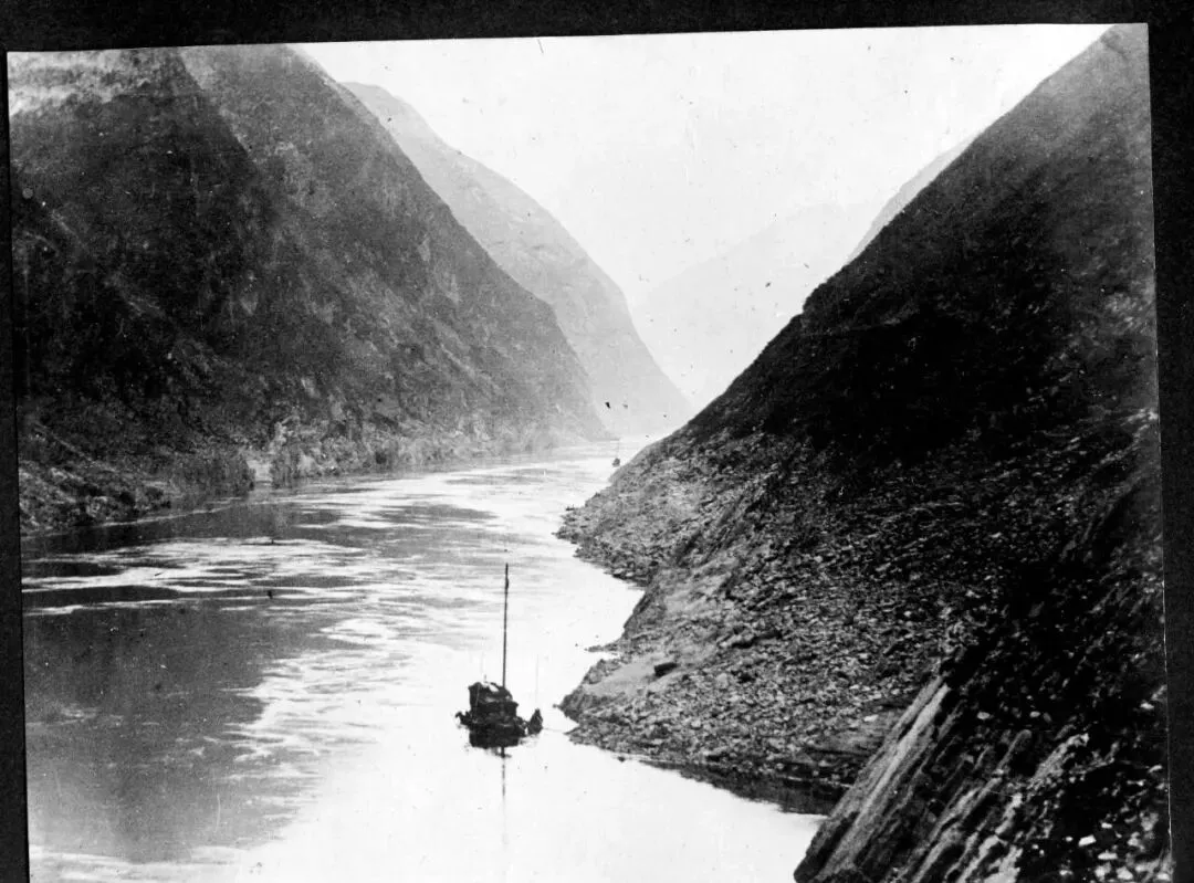 这一张几乎全是山和水,江面泛着光,一叶孤舟顺流漂去,四周是陡峭石壁。图中这条水路该是长江段,没什么花头,就是纯粹的壮阔。家里老人念念叨叨,说以前走水路,是靠纤夫拉船,几个人踩着石缝拽着粗绳子,遇到涨水季,还得两岸对喊号子鼓劲。现在要过长江坐大轮船都稀松平常,百年前想从江东跑到江西,那得下大决心,这样的孤舟和江浪,现在看着有点孤单,却也是旧时中国的一种勇气,一条船就是一个远行的梦。