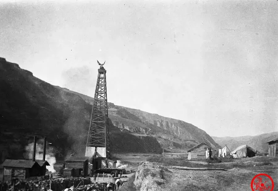 这个高高的铁架子叫油井塔楼,背后是一整面起起伏伏的黄土山坡,油烟沿着山风卷上去,塔顶还挂着个装饰,好像给这一带添点神气,下面人群围在一起,谁知道他们那时的心思,是盼着新生活,还是盘算着一天饭钱。