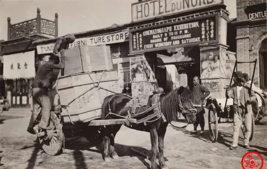 门口“HOTEL DU NORD”的招牌挂得老高,外国洋人开的饭店,赶马车的却还是老百姓,马皮鼓鼓的,尾巴下还看得见那根铁耙,防着甩鞭子打得不响,爷爷讲过,那会儿洋货进门,头一件得先过这一关。