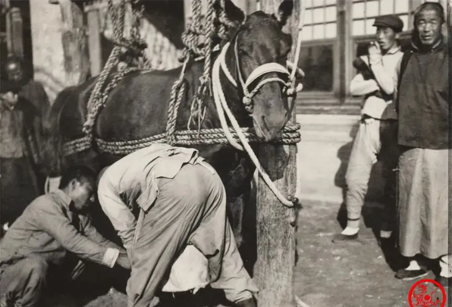 这张是老北京街头常见的画面,被麻绳五花大绑的马,四蹄子拴得死紧,旁边的伙计弯着腰正修蹄子,马的眼睛往边上一斜,一脸不服气。
