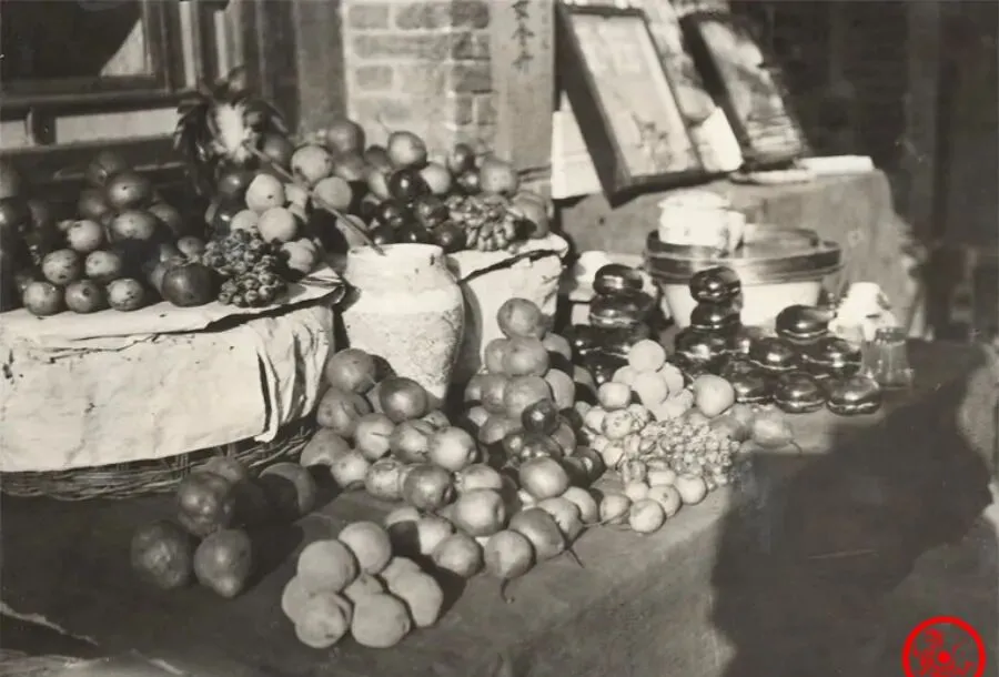 这摊水果说花就花,说素也素,摆着梨、柿子、葡萄,边上是个大瓷罐,外头盖块白布防灰尘,高矮层层叠叠,满是基本款。