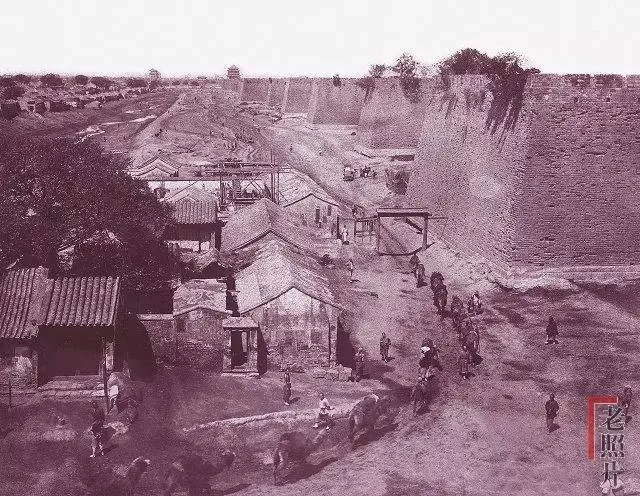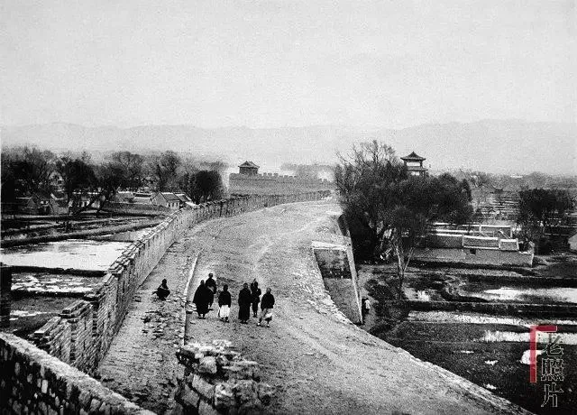这是一张站在府城东城墙上由北往南拍摄的照片,几位长袍马褂打扮的人在宽阔的城墙顶上悠闲散步。
