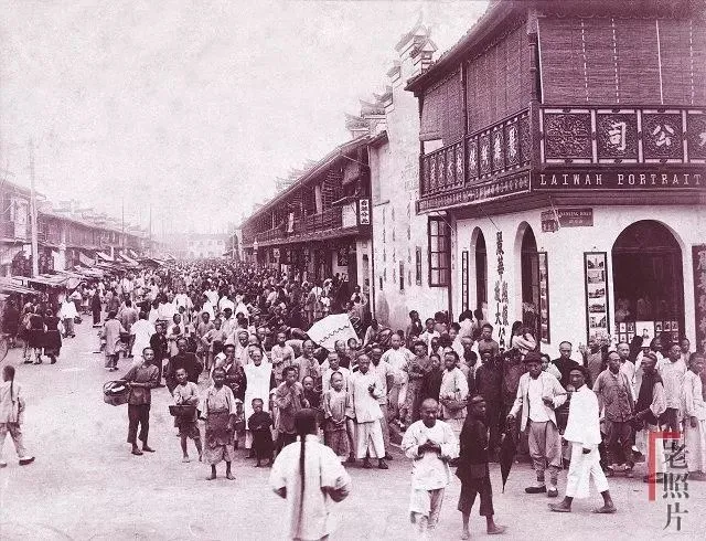 晚清时代,刚刚开埠不久的上海南京路,前景是一所照相馆,远近的人都在恬然地面对着眼前的摄影机。