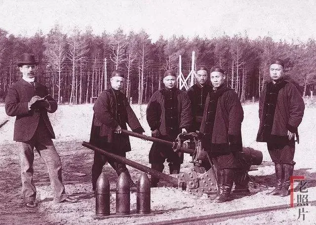1890年摄于德国埃森梅喷射击场。左一为德国教习瑞乃尔,右二为段祺瑞,余者为商德全、吴鼎元、孔庆塘、滕毓藻。