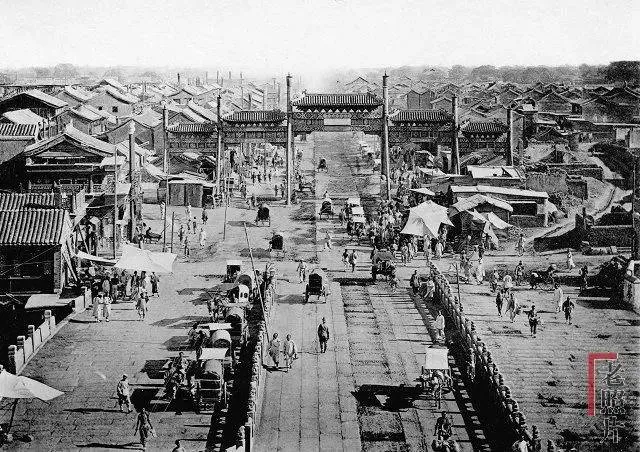 1900年庚子国难后的北京前门大街,照片右侧一片倒塌的房屋,熙熙攘攘的人群中穿着长衫的中国男子与一身制服的外国军官擦肩而过。