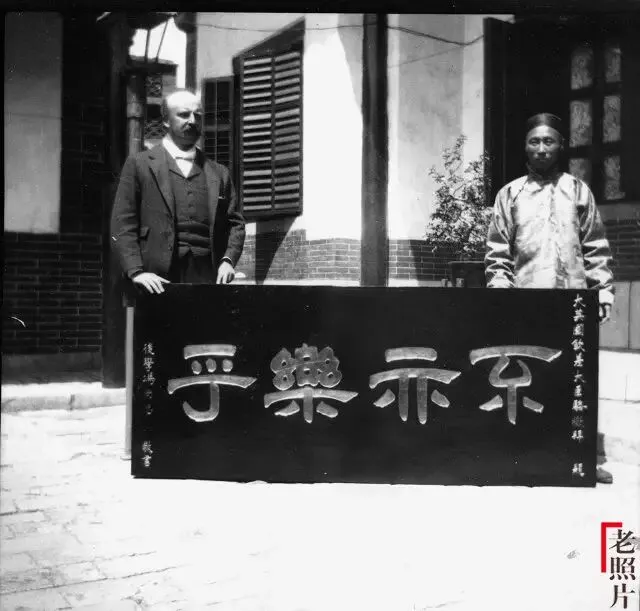 威海卫租借地行政长官骆任廷拜访曲阜,赠送给第七十六代衍圣公孔令贻牌匾。"大英国钦差大臣骆檄拜"等字样清晰可见。摄于1903年。