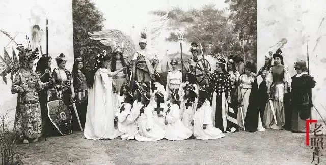 20世纪初,天津外国人租界中的洋人在集体排演戏剧,从扮相来看也是华洋皆有。