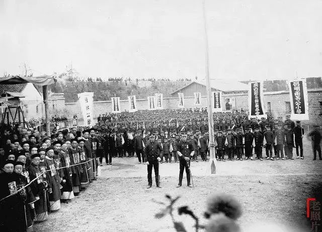 庚子国难后,清廷逐步实施新政。一身旧打扮的官员与着新式服装的学生,在同一会场集会。