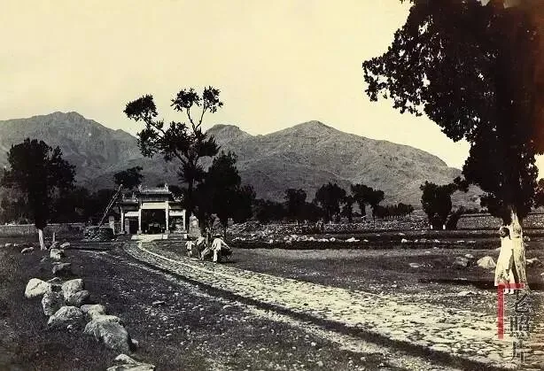 通往岱宗坊的石板路坑洼不平,一位白衣男子推着独轮车行进在路旁的平地上,走在前边的女子弯腰拉着车子,另一只手紧紧地握住男孩的手。远处的泰山巍峨,自古至今;近处的书生忧郁地看着远方,衣袂飘飘。摄于1908年。