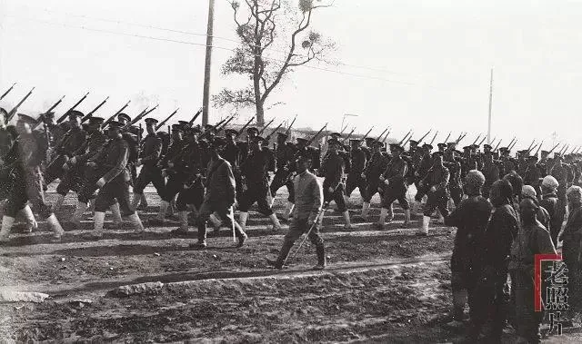 参加兵演的新军既有步兵也有骑兵,服装类似于外国军队制服,军官着靴子,士兵则着布鞋,裹绑腿,不变的是脑袋后都有一条大辫子。图为行进的步兵。