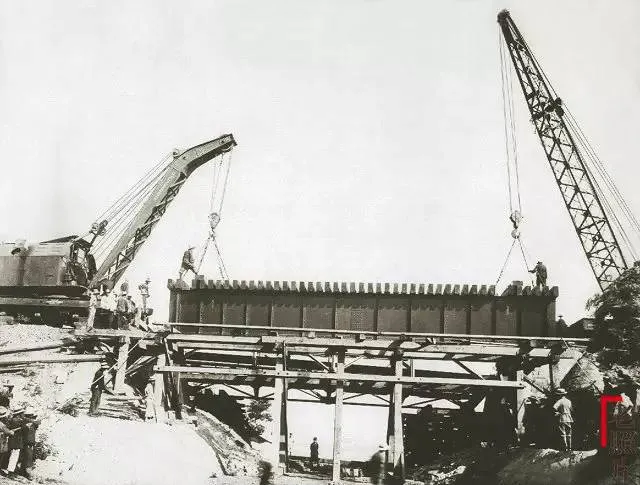 1925—1926年,中国政府出资对胶济铁路进行了大规模的整修。图为工程人员在现场用大型吊装机械进行施工作业。