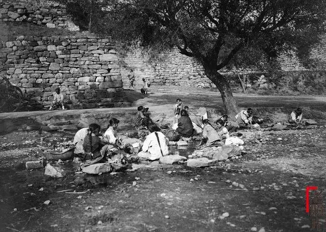 北方农村妇女聚集在河边洗衣,一派静谧、安详的情景。摄于1927年。
