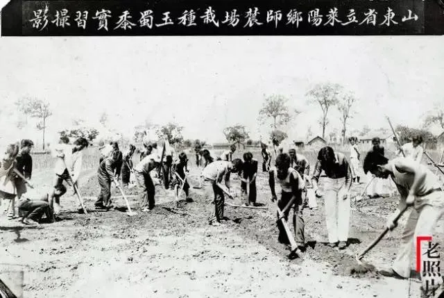 1930年,山东省立第二乡村师范学校成立,1934年2月易名为山东省立莱阳简易乡村师范学校,七七事变后停办。图为乡师学生在农场种植玉米。