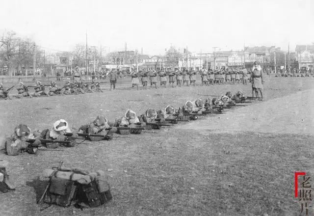 七七事变前,日军在华北屯集精锐。图为日军北平驻屯军在使馆区练兵场操练,远处是北平市街及围观的中国民众。