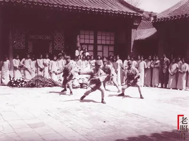 二十九军大刀队为广东省女师慰劳队表演中国传统刀术。