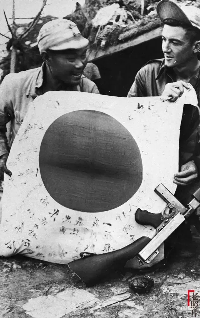 1944年9月8日,中美士兵联合展示在战斗中缴获的日军太阳旗。前为在战斗中发挥显著作用的美式“汤姆逊”冲锋枪和美式手雷。