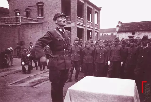 1945年9月,中国第三方面军高级参谋曹大中视察芜湖日军集中地,向放下武器的日军官兵训话。